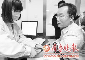 医护人员正对薛长城抽血体检。 本报记者 李军 摄