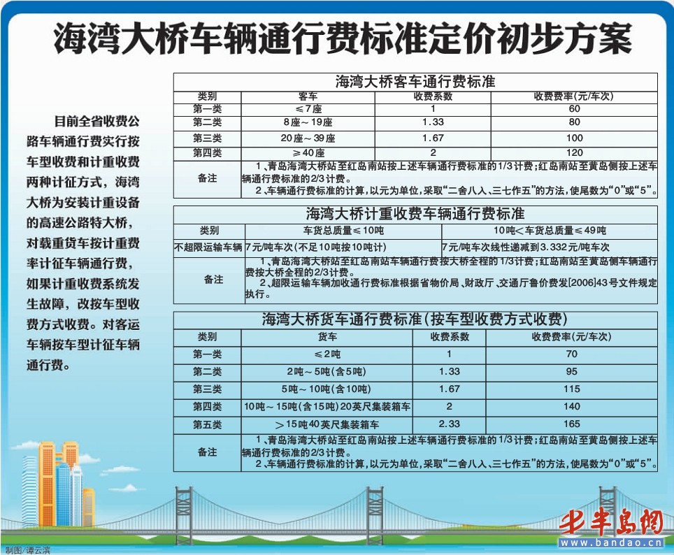 车辆通行费标准的计算,以元为单位,采取“二舍八入、三七作五 ”的方法 ,使尾数为“0”或“5”。此外,青岛海湾大桥站至红岛南站按正常车辆通行费标准的1/3计费;红岛南站至黄岛侧按正常车辆通行费标准的2/3计费(具体收费方案详见图表)。