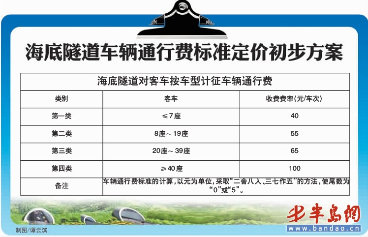 5月25日,市物价局发布了海湾大桥、海底隧道车辆通行收费标准定价初步方案,根据初步方案 ,海湾大桥、海底隧道对客运车辆都按车型计征车辆通行费。而车型又分为≤7座、8座~19座、20座~39座、≥40座四类。
