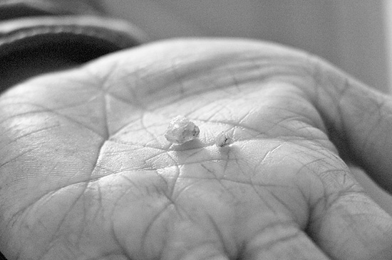 2月16日,丁爱华再次剧烈头疼,并从眼中“抠”出一块石子。为减轻老伴的痛苦,梁新春想了个办法,把一根铁丝弄弯,从老伴眼里取出石子。在记者的见证下,梁新春又从老伴的眼中取出两粒石子:一粒黄豆般大小,暗黄色;一粒玉米粒般大小,呈银白色,质地坚硬。