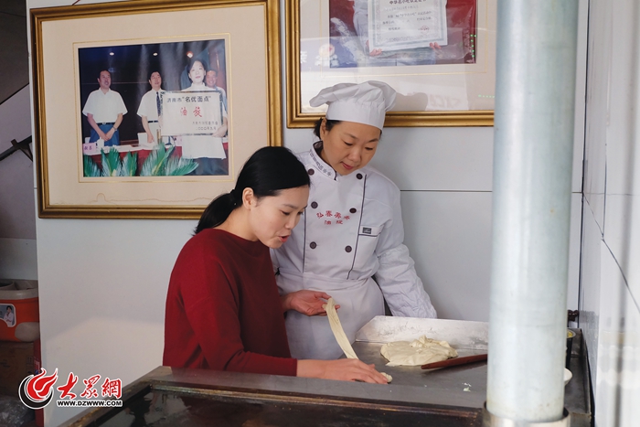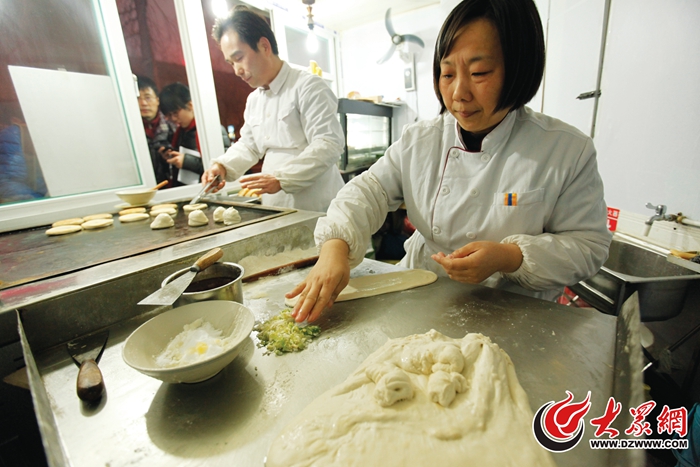 她看起来并不是名号冠身的那样高深莫测,只是皮肤略黑、声音洪亮的中年女性。当她挥动着擀面杖打点,白色面团在手中跳跃,一翻一搭间才会显出高级面点师的风采。层层叠叠的面团将在卢利华手中蜕变成济南“老字号”的标志。“再没个家,老聚丰德的油旋可能就没了。”卢利华说,“油旋要是真绝了,离老济南小吃全部消失的那天就不远了。”
