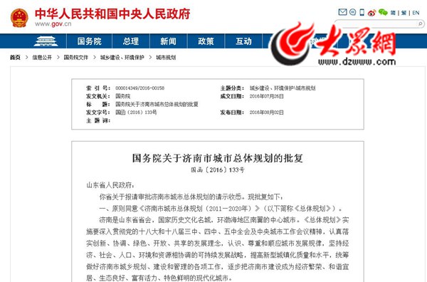 大众网8月2日讯 据中国政府网消息,国务院批复同意济南市城市总体规划,全文如下: