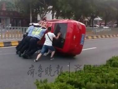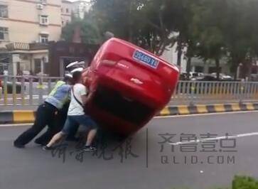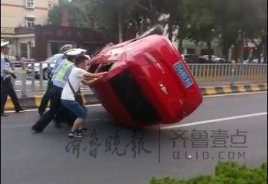 根据袁先生提供的现场视频,齐鲁晚报·齐鲁壹点记者看到,一辆红色雪佛兰轿车四轮朝天翻倒在道路中央,而几名轿车和一名疑似车主的男子正在将轿车翻转过来。记者看到,红色轿车右前轮处的车体破损,引擎盖也变了形,而肇事的白色轿车左前轮处车体也撞得凹陷进去。