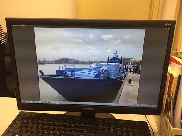 办案人员用电脑展示装载4万瓶美容针剂的走私船。