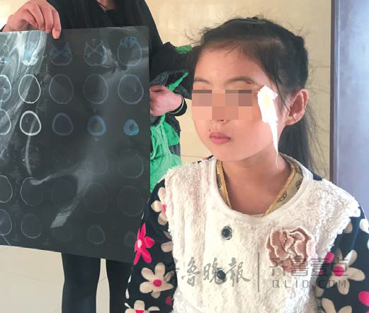 14日,泰安市徐家楼街道白峪店子小学三年级学生小媛,从国庆节放假后就一直没去学校。她左眼眉骨现在仍然贴着纱布,消肿的伤口正在结痂。说起9月30日上课时的事发经过,小媛说只记得自己正在上课,突然眼前飞来一个黑色东西,紧接着头一疼,一摸脸上出血了。