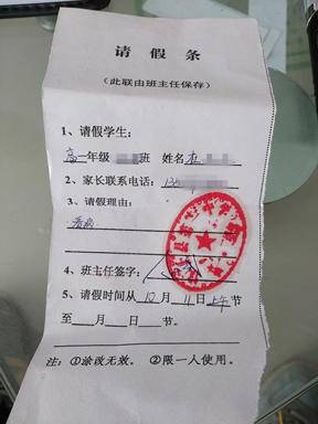 对于当时的情况,班主任马斌拿出了杜某玉离开学校前写的请假条。这张请假条上除了杜某玉的签名之外,还有她父母的联系方式、请假原因,以及请假时间,请假原因写的是“看病”,请假时间为“10月10日”。马斌介绍,10日晚上自习的时候,杜某玉的母亲打电话联系他,说女儿肠胃不好,要去济南的大医院看病,希望请假。