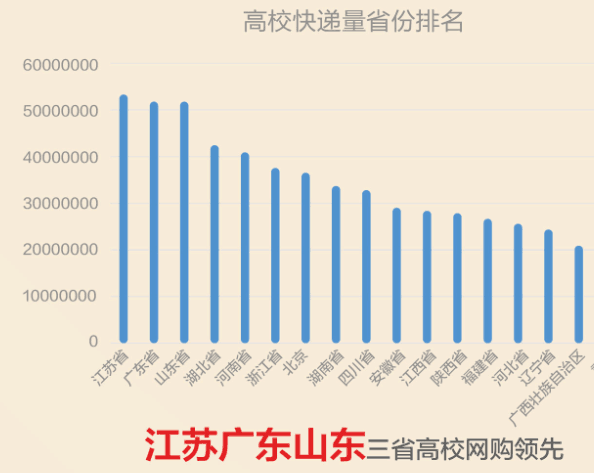 记者了解到,去年高校大学生人均年收快递16个,高校包裹数约占全国总量的6%,直接带动7万个就业机会。在高校快递量省份排名中,江苏、广东、山东等3个省份去年的快递量都突破了50万件,而第四、五位的湖北省、河南省仅40余万件,与榜单前三名相差较大。