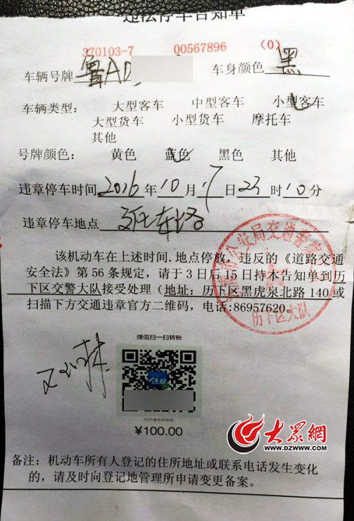 “该机动车在上述时间.地点停放,违反的《交通安全法》第56条规定,请于3日后15日持本告知单到历下交警大队接受处理,或扫描下方交通违章官方二维码”。今天上午,济南网友“果冻”在微博上发布了这样一张异样的违停罚单照片,从图片来看这张罚单不仅语病百出,而且下方的二维码尤其别扭。