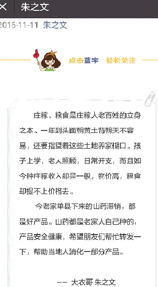 记者查阅到这位读者所称的消息,它来自一个叫“朱之文”的未经认证的微信公众号。这则题为“大衣哥朱之文:请帮帮单县这些山药滞销的农民兄弟”的信息称:“今老家单县下来的山药滞销,都是好产品。山药都是老家人自己种的,产品安全健康,希望朋友们帮忙转发一下,帮助当地人消化一部分产品。”