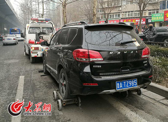 昨天,济南历城区一辆违法停放的车辆被拖走