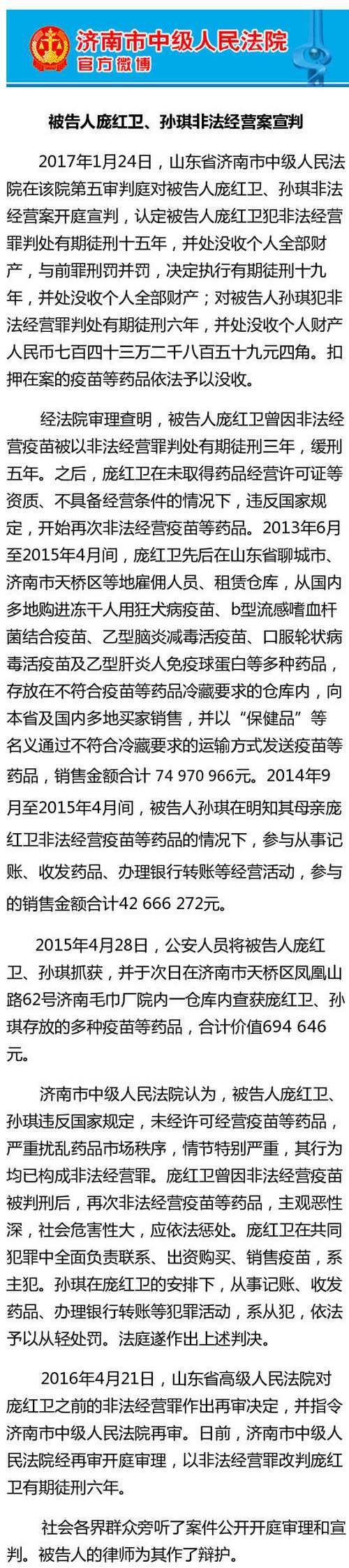 大众网1月24日讯 据济南市中级人民法院微博消息,24日,山东省济南市中级人民法院第五审判庭对被告人庞红卫、孙琪非法经营案开庭宣判,认定被告人庞红卫犯非法经营罪判处有期徒刑15年,并处没收个人全部财产,与前罪刑罚并罚,决定执行有期徒刑19年,并处没收个人全部财产;对被告人孙琪犯非法经营罪判处有期徒刑6年,并处没收个人财产人民币743.28594万元。扣押在案的疫苗等药品依法予以没收。