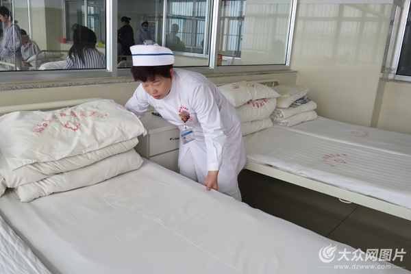 精神科的工作很琐碎,除了要为患者提供医疗服务外,还要照顾患者的生活。护士长李清华在帮助患者整理床铺后,推着扫床车,将洗衣房清洗干净的被服送到仓库分类放置。