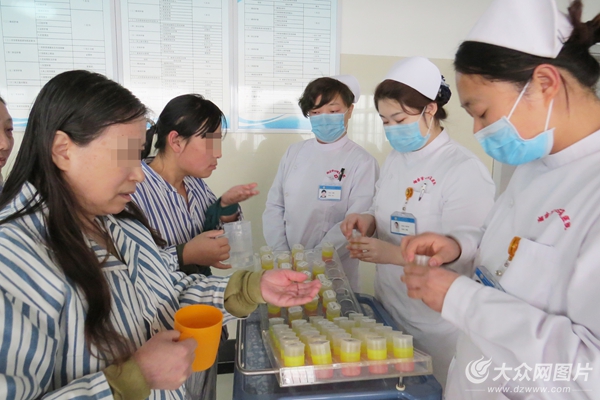 上午10点,是患者的服药时间。护士们会看着每一位患者将药物服下。“患者需要每天按时服药,但有些患者比较‘调皮’,会把药藏在嘴里,趁我们不注意时再吐掉;有的甚至会抠自己喉咙,把吃下的药吐出来。我们必须要看着每位患者服药,并仔细检查,确定患者将药服下后才能放心。”李清华说。