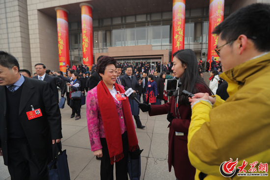 2月6日上午,山东省十二届人大六次会议开幕大会后,省人大代表滕玉云接受大众网记者采访。
