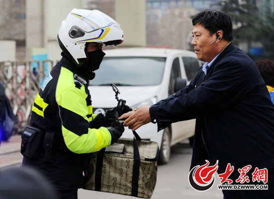 图为济南交警市中大队民警在体育中心与出租车会合拿到考生的工具箱