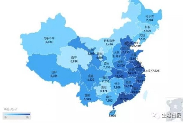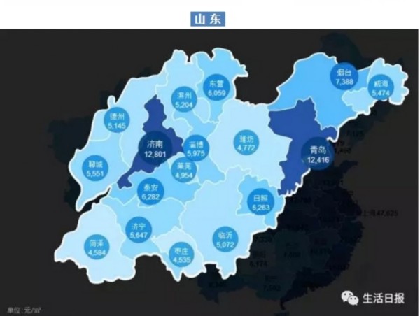 全国房价地图近日出炉,经济发达的省份,其省会和省内经济排名第一的城市,对比同省其他城市的房价,呈现碾压的态势——比如,经济总量排第三的山东。山东的济南和青岛,都在均价12000左右,而同省其他城市,潍坊菏泽莱芜均在5000以下,枣庄、临沂、德州、聊城、济宁、滨州威海,不及济南、青岛的一半。