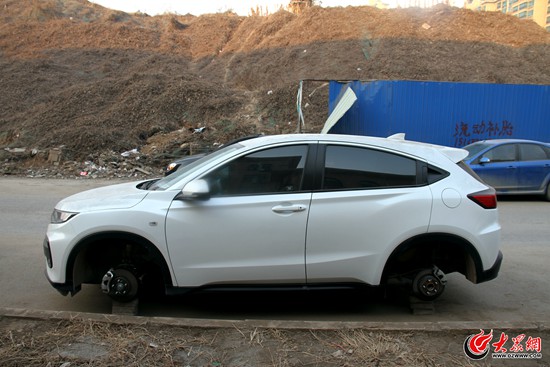 1月23日早,济南市历城区王舍人庄派出所接到群众王先生报警称,当天早上7点左右他准备上班时,发现自己停放在自家小区马路对面的私家车竟然“悬空”了。据王先生描述,汽车面向马路的一侧没有异常,绕到马路牙子一侧才发现,内侧两个汽车轮胎全都不翼而飞,只剩几块砖头勉强撑着车身。