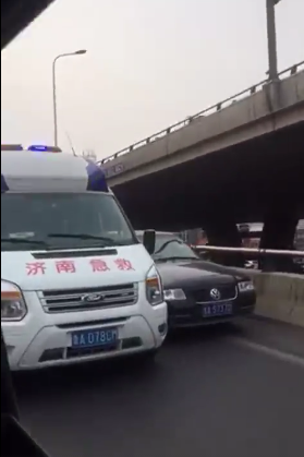 记者注意到,在这段文字下面还附有一段长10秒钟的秒拍视频。视频中,一辆济南牌照的急救车闪着警灯、拉着警报行驶在高架桥上,急救车左侧是一辆黑色的轿车。