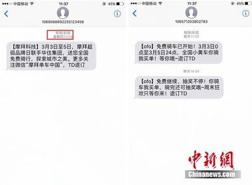 有用户对中新网反馈,最近经常收到摩拜和ofo的免费骑的短信,有时候甚至到晚上11点了,还能收到短信,告知明天可免费骑。