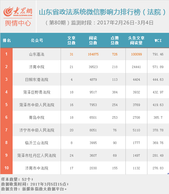 第八十期法院机关微信影响力排行榜,“山东高法”以791.46分高居榜首,并拿下四个单项冠军,其最受关注的两篇文章分别为《最新!2017年山东省人身损害赔偿标准》和《最新!2017年一次性工亡补助金标准确定:672320元(全国统一)》,阅读数分别为53627和19872。“济南中院”和“日照东港法院”夺得第二和第三。十强中有八个账号排名都获得不同程度的提升,继续加油!