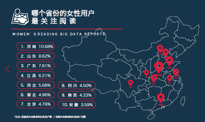 在全国各个省市自治区中,哪里的女性更关注阅读呢?答案是河南,山东与广东紧随其后,北京排名第七,上海未上榜。对比纸书购买的金额,对于北京上海的女性来说,她们虽然在购书的金额上远高于其他地区,但花在阅读上的时间和二线城市的女性相比并没有太大的差距。像河南、山东、江苏等地的女性,在阅读习惯上反倒更接近于发达国家:她们更喜欢阅读文学类作品,不同年龄段的女性阅读差异较小。