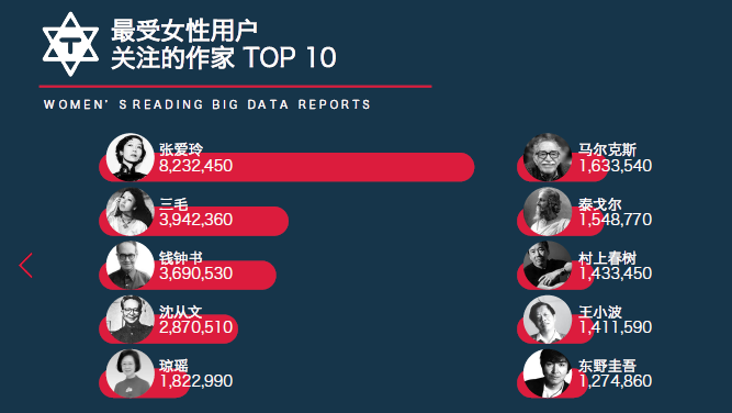 在最受女性用户关注的作家TOP10中,仅有三名女性作家。在榜单中,钱钟书、沈从文出人意料的位列琼瑶之上。马尔克斯的魔幻、泰戈尔的诗歌、村上春树的情感、东野圭吾的悬疑,这些不同类型的作家作品已经成为女性书单的常客。女性读者已经从情感和内心的小世界走向更加丰富多彩的大世界。既能描写细腻的情感,又能讲述精彩的故事,比如村上春树和东野圭吾这样的作家,会受到越来越多的女性的喜爱。
