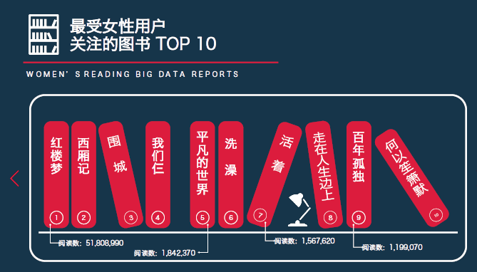 在女性用户最受关注图书TOP10中,古典的《红楼梦》《西厢记》高居榜首,近代的《围城》、回忆录《我们仨》紧随其后,然后是现代的《平凡的世界》……为何《红楼梦》《西厢记》与现代生活距离遥远,仍然关注不减?小编认为,虽然世殊时异,但人情却千年未变,喜怒哀乐、爱恨嗔痴,对于这些情感的感悟,古今偕同。和现代读者之间产生了一种奇妙的穿越时光的共鸣。所以这些小说能够历久弥新,一直被读者所喜爱。值得注意的是榜首图书《红楼梦》,它的阅读数量远超其他作品,这说明《红楼梦》已经不仅仅是一部作品,更是作为一种文化符号和文化现象存在于广大读者心中。