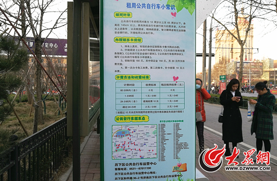 10日下午,大众网记者在济南历下区和平路的公共自行车停车点看到,在租车点上新张贴了一张《租用公共自行车小常识》。