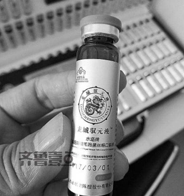 记者看到,产品的名称是龙城驭元液,产品包装注明是由山西水塔老陈醋股份有限公司生产的,生产日期是2017年3月1日。配料主要是陈醋、蜂蜜、木糖醇等,上面明确说明“本品不能代替药物”,并说此饮品具有增强免疫力的作用。