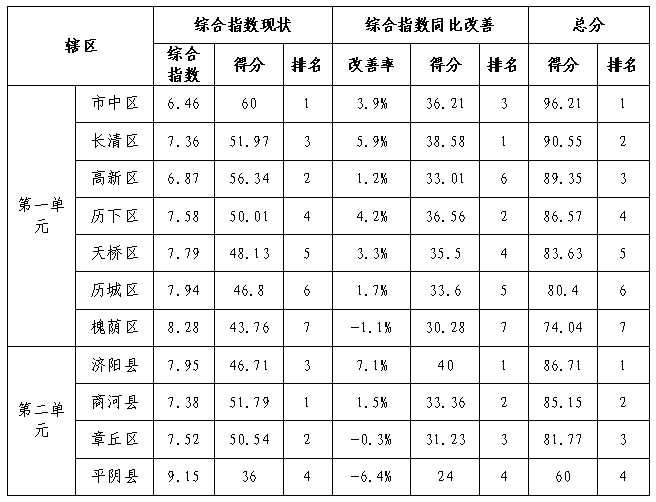 2017年2月份,济南空气质量第一单元得分从高到低依次为市中区、长清区、高新区、历下区、天桥区、历城区和槐荫区;第二单元得分从高到低依次为济阳县、商河县、章丘区和平阴县。