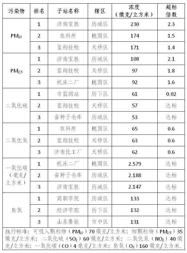 根据统计,2017年2月份,济南宝胜(历城区)站点PM10、PM2.5浓度均列全市倒数第1名,PM10超标2.3倍,达到230微克/立方米;PM2.5超标2.1倍,达到108微克/立方米。市监测站(历下区)二氧化硫浓度列全市倒数第1名,农科所(槐荫区)二氧化氮浓度列全市倒数第1名。(大众网-山东24小时记者 姜洋)