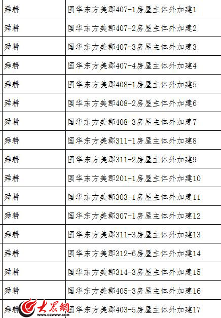 大众网记者注意到,在这次公布的违法建设拆除台账中,国华东方美郡有17处主体外加建上榜,另外,芙蓉街的10处板房,泉乐坊的圆缘园、BUFF酒吧违建以及南部山区的多处农家乐违规建筑也在这次拆除之列。(大众网-山东24小时记者 贺辉)