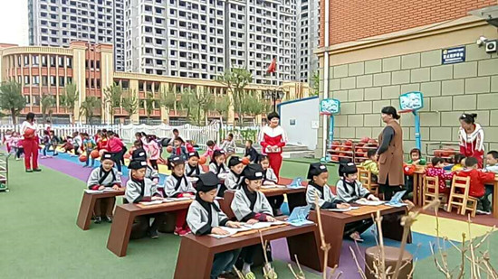 司家庄社区幼儿园小朋友正在操场上朗诵古诗词,他们的身后,司家庄棚改二期工程正在加紧施工中。