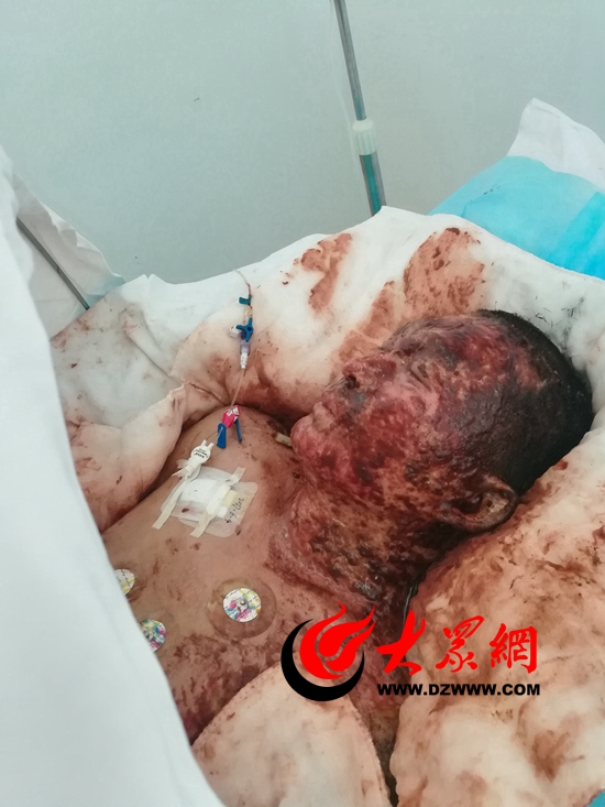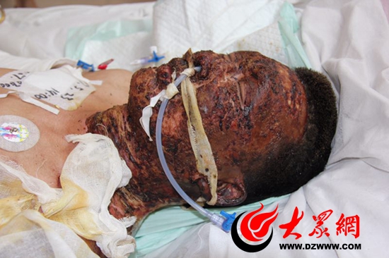 济南万厚中医医院烧伤科主任李春梅告诉大众网记者,昨天第一眼见到王晖时,心里猛抽了一下——王晖整个脸部都被烧黑了!除了眼珠能动,王晖其他部位都是焦黑焦黑的,并已经开始感染。剧烈的疼痛,让这个35岁的小伙已经有些神志不清。