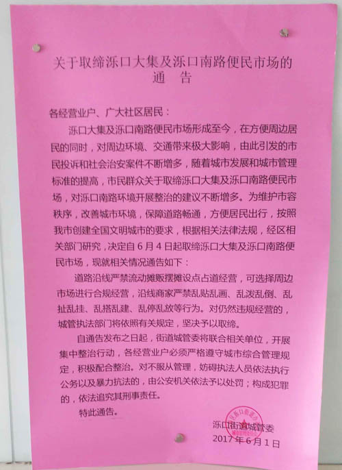 泺口街道办《关于取缔泺口大集及泺口南路便民市场的通告》