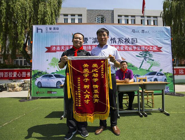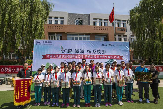 “爱传百校”大型公益爱心活动旨在通过联合爱心企业,为乡村小学捐赠最新的图书读物,解决乡村小学图书室新书更新困难,同时丰富小学生的课余文化生活,让乡村学子在读书中增长知识,享受阅读带来的乐趣。活动现场,济南市委办公厅驻柳埠镇大峪村扶贫“第一书记”冯传真、山东省互联网传媒集团大众海蓝公司总经理陶云江共同为大会小学“爱传百校”爱心图书室揭牌,济南市历城区柳埠镇大会小学校长常德才向济南天鸿雷克萨斯技术总监王金军赠送爱心锦旗,雷克萨斯济南车友会成员和大会小学学生参加捐赠仪式。