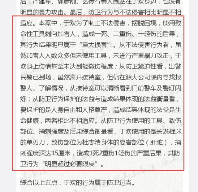 那么如此一来,于欢导致的1人死亡、2人重伤、1人轻伤的防卫行为,就明显超出了不法侵害的程度,因此无法认定为正当防卫了。