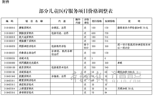 记者从烟台市物价部门了解到,根据《关于印发〈贯彻国卫医发〔2016〕21号文件加强儿童医疗卫生服务改革与发展工作方案〉的通知》(鲁卫医字〔2016〕31号)的要求,烟台市调整部分儿童医疗服务价格。6岁(含)以下儿童手术价格,在现行价格基础上提高20%。6岁(含)以下儿童一般治疗操作、有创活检、探查等项目价格,在现行价格基础上加收20%。