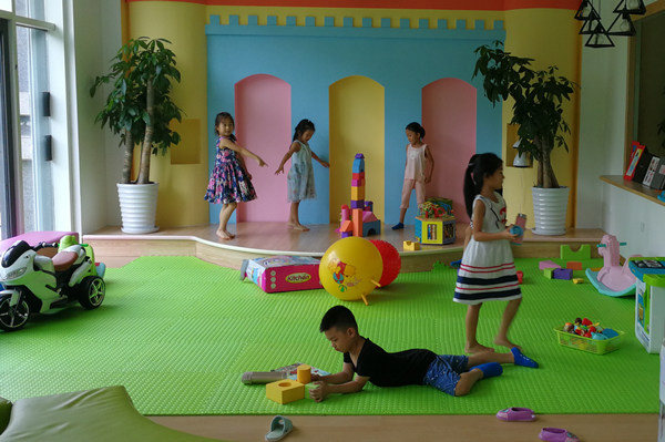 该机构内多名儿童在大厅玩耍打闹,工作人员称都是自家孩子