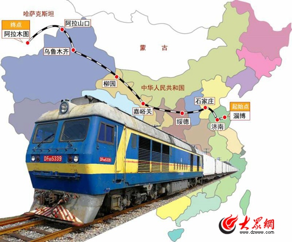 班列自山东淄博出发,经河北、山西、宁夏、甘肃、新疆,由阿拉山口口岸出境,最终到达哈萨克斯坦第一大城市阿拉木图,全程运行4657公里,预计12天左右到达。