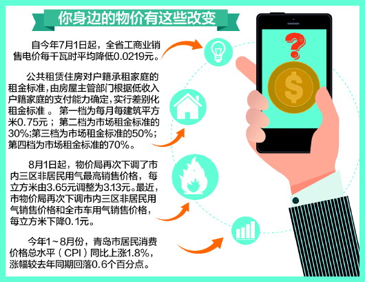 物价越来越高工资反而越来越低,这怎么办?辛增顺介绍,在提高居民收入方面,青岛市综合采取了扩大就业、建立企业工资指导线制度等措施,努力保持居民收入与经济发展同步增长。而且,本市已连续7年提高城乡低保标准。同时,根据物价上涨情况,2016年以来,先后9次启动联动机制,为低保群众发放物价补贴5500余万元,惠及133.6万余人次。在增加收入的同时,青岛市始终将稳定物价作为宏观调控的首要任务,综合采取诸多措施,努力将物价上涨稳定在与经济发展水平相适应的合理区间。今年以来,青岛市粮、油、肉、蛋、菜等重要生活必需品市场供应充足,价格总体运行平稳,1~8月份,青岛市居民消费价格总水平(CPI)同比上涨1.8%,涨幅较去年同期回落0.6个百分点。