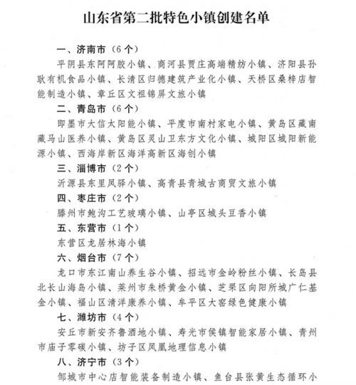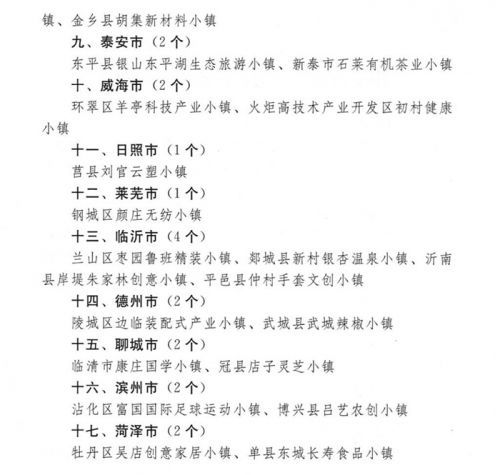 滨州3个:滨城区三河湖教育小镇、沾化区冯家渔民文化小镇、阳信县水落坡古典家具小镇