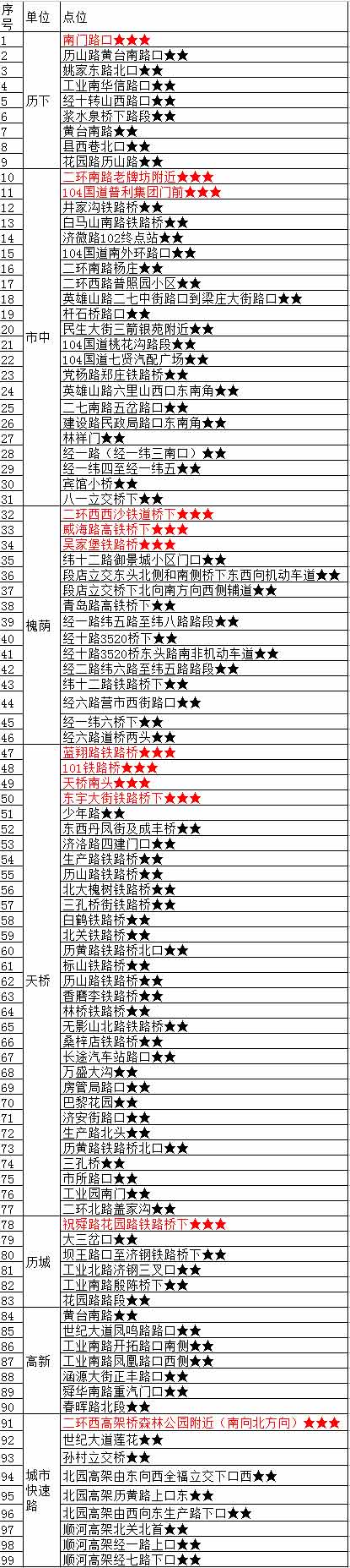 大众网济南5月15日讯 根据济南市气象台发布强降雨预报,预计今天下午到夜间全市有较明显降雨过程,平均降雨量25-35毫米,局部地区降雨量超过70毫米。济南交警根据排查,统计出了最新版的市区桥梁、涵洞等易积水路口、路段共99处,请市民密切关注降雨及路况信息。