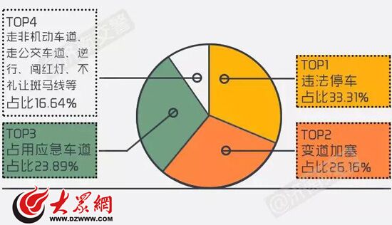 在济南开展“随后拍”举报交通违法的近4个月的时间内,交警共收到市民群众提供的举报线索61256条。被举报较多的交通违法行为有:违法停车,占33.31%;变道加塞,占26.16%;占用应急车道,占23.89%。此外,违法占用非机动车道、违法占用公交车道、逆行、闯红灯、不礼让斑马线等也是举报较多的违法。