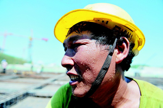 □新华社发 青岛火车西站建筑工地,一名工人在铺设钢筋。