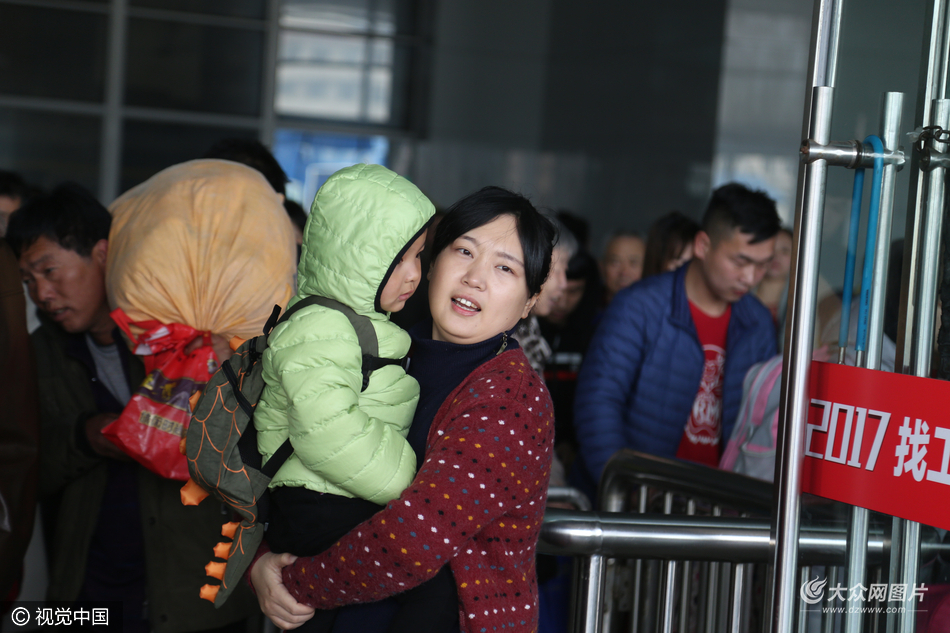 2017年3月6日,山东烟台。赵爱萍抱着孩子走出火车站。