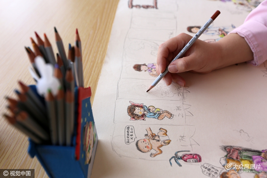 2017年3月3日,青岛。在青岛市妇女儿童医院的产科六区,墙上有一幅幅可爱的漫画。无论是身穿白褂威风凛凛的“夜护侠”,还是怀抱婴儿的柔情妈妈,都是出自护士于意之手。