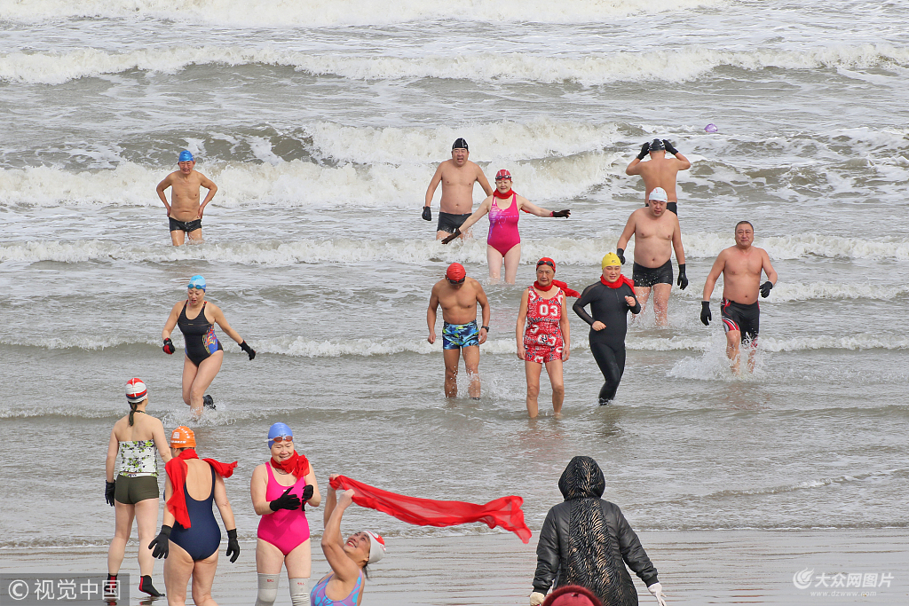 组照说明:2018年1月26日,山东省烟台市,一群中老年冬泳爱好者冒着零下10度的低温下海冬泳,并在岸上玩雪,抗寒能力惊人。