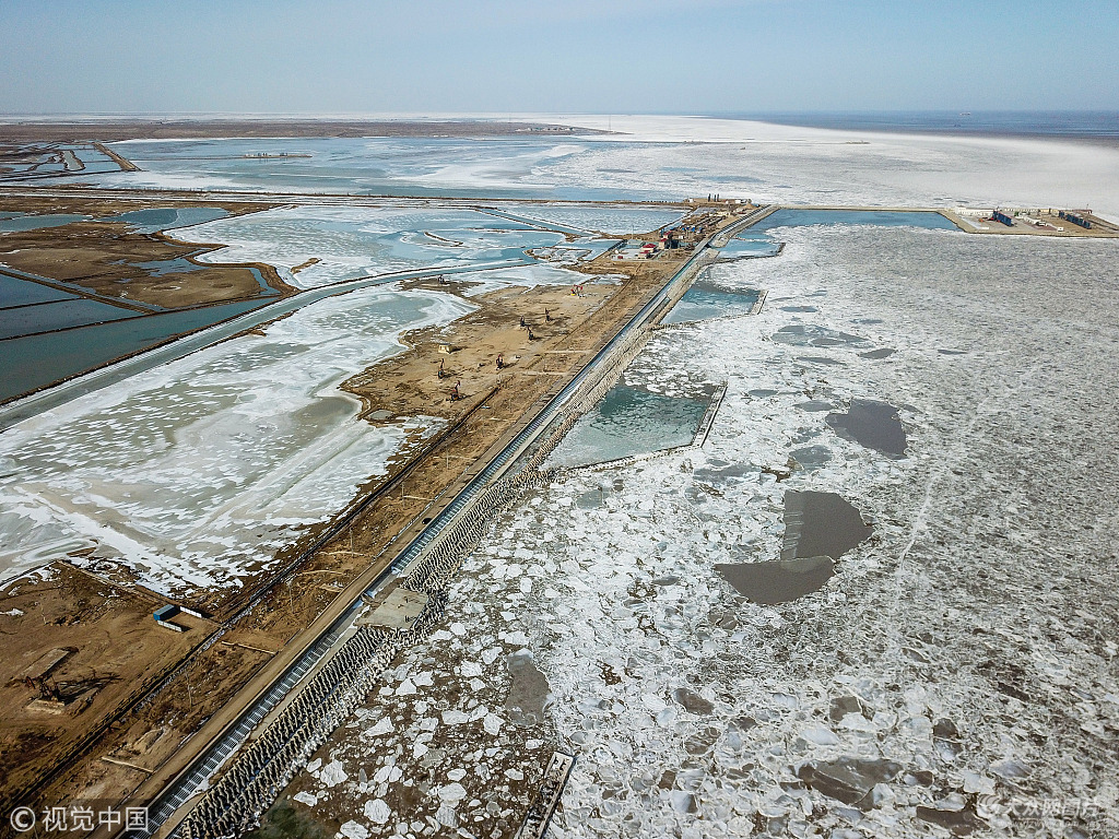 组照说明:2018年1月31日,山东省东营市,由于气温短暂回升,海冰厚度下降,当地的工程运输、海上油田巡线船只重新通航,船只划破冰面,在海面留下明显航迹。