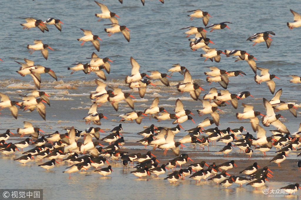 组照说明:2018年2月1日,山东青岛胶州湾湿地冰雪初融,大群候鸟在海冰退却的滩涂上起舞鸣唱,巡游觅食,场面蔚为壮观。